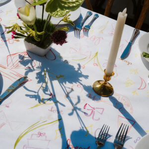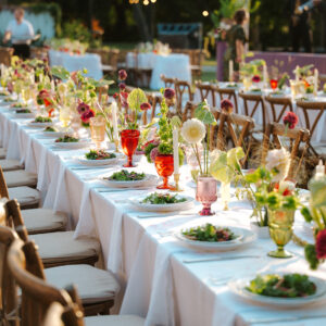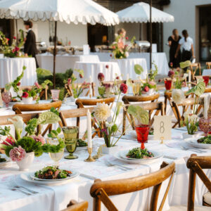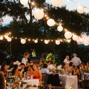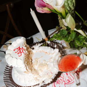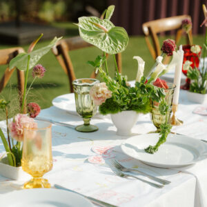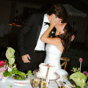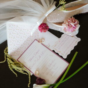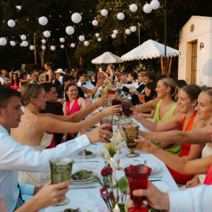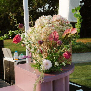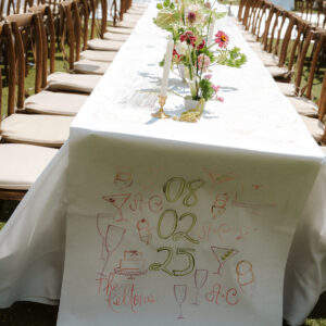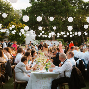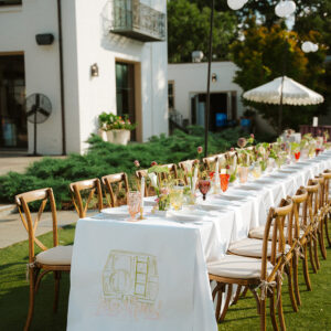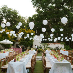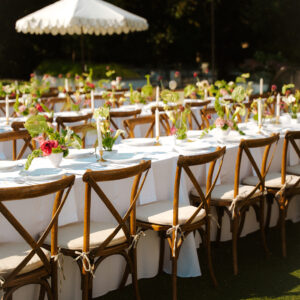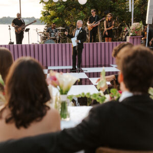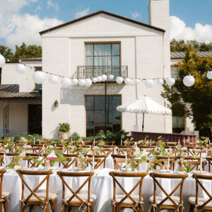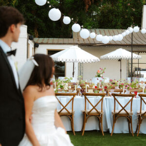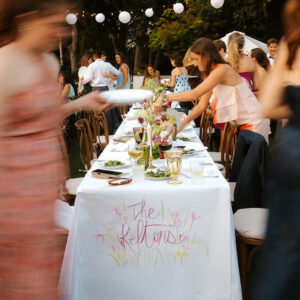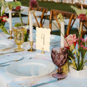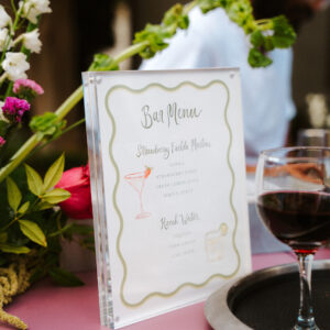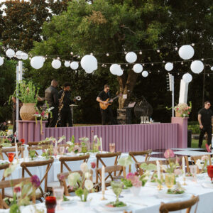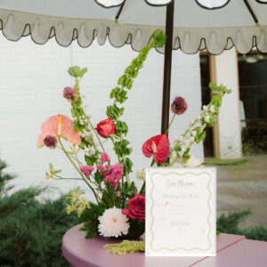 From there, guests moved to the outdoor ceremony site complete with long colorful tables and paper lanterns, from Big D Party Rentals, strewn about. Lawson Event Rentals provided linens and chairs, while Wiild Violet Rentals decorated the tabletops. Ella Kate Cotte Art created beautiful artwork to sit atop the tables, while Lucy Barfield Creative designed custom stationery shown throughout the reception. Render provided custom rental pieces to complete the space including a ribbed pink bar and stage facade.
