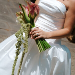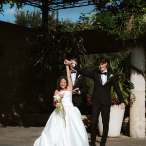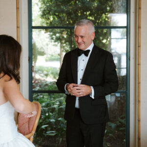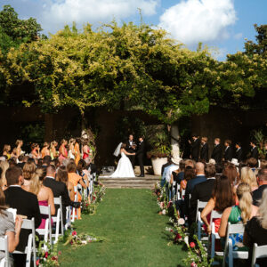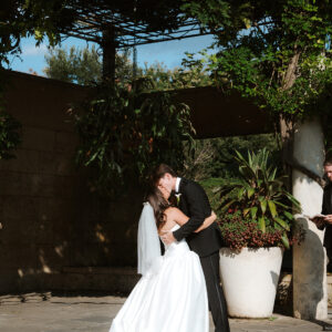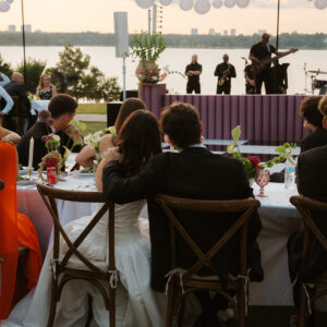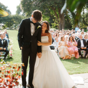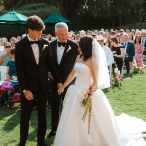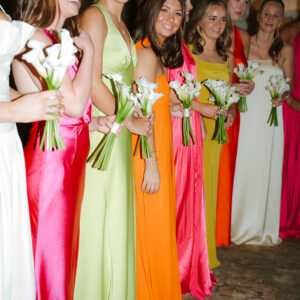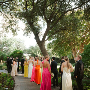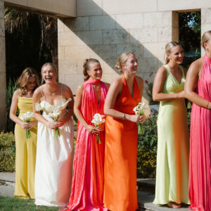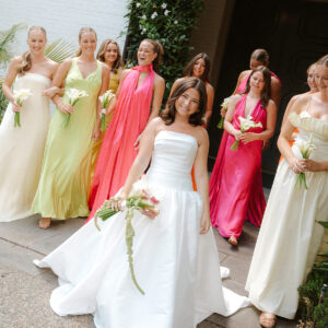Our bride slipped into her Anthropologie Weddings gown as she had a stunning bouquet from Magnolia Fields Floral Co. in hand. Her bridesmaids all wore varying shades of bright colors including orange, pink, and green. The groom and his groomsmen got ready in separate quarters as they suited up in their Black Tux tuxedos. The bride and groom shared an intimate first meeting, where they shared personal vows. Dallas String Quartet set the mood as guests gathered for the outdoor ceremony. The bride and groom said ‘I do’ in front of their closest friends and family, under the warm August sun.