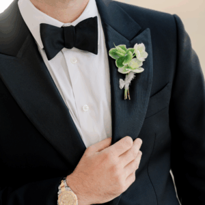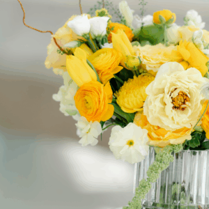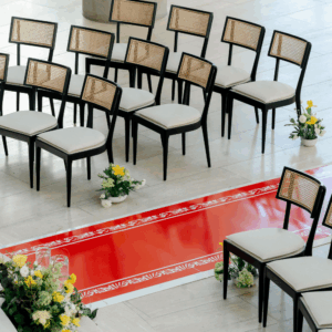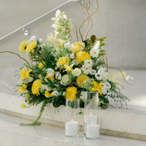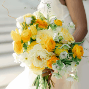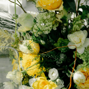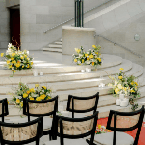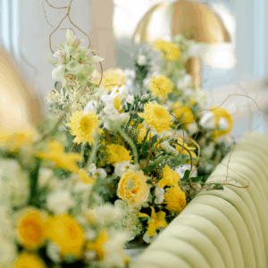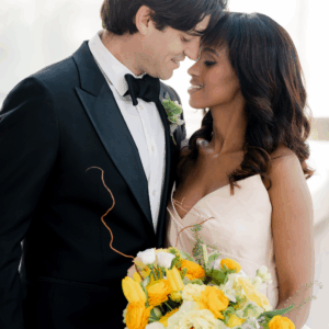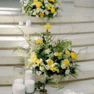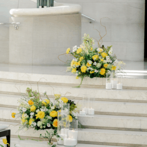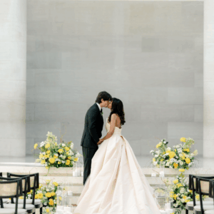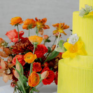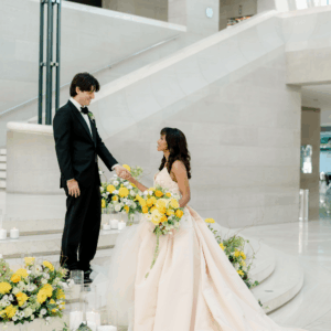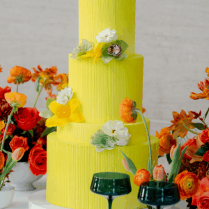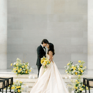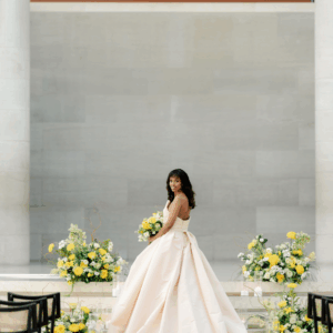 The model couple for this styled shoot had beautiful chemistry as they played a bride and groom-to-be. The bride wore a strapless Neiman Marcus gown, holding a bright yellow bouquet from Scout Floral. Styles by Vero provided the hair and makeup services to style the bride prior to the shoot. At the makeshift ceremony site, there was a custom aisle runner from Imperial Floors, lined with bursting yellow floral arrangements and candle votives. Our models posed for photos as they twirled around the ceremony space. The bright yellow cake was provided by Fancy Cakes by Lauren and donned in blooms. This styled shoot was such a fun color palette to play within from lush florals to complimentary chairs and facades, we loved being able to bring this vision to life!