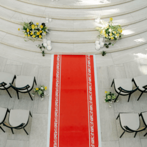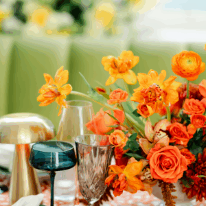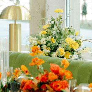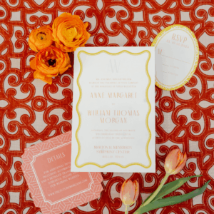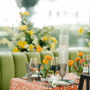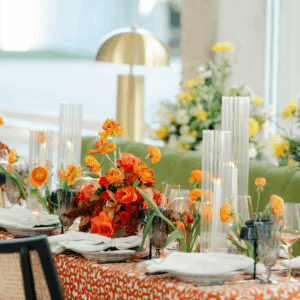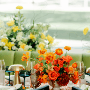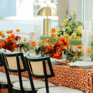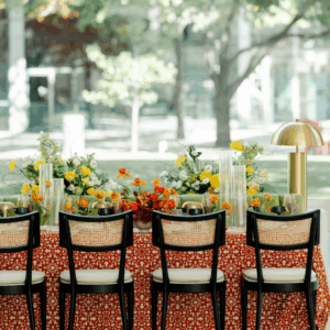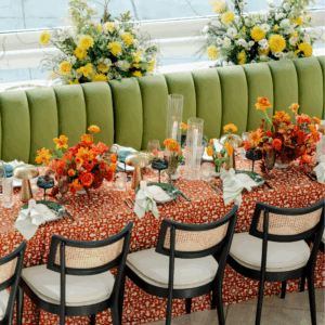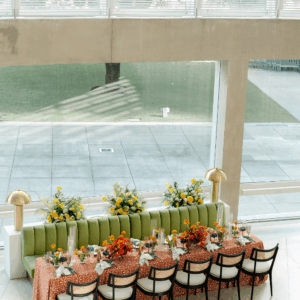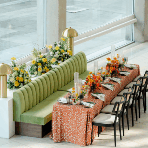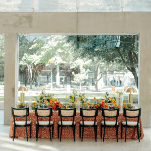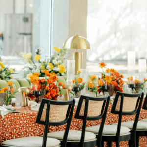 Render Events, along with their sister company Scout Floral, provided the perfect rental pieces and floral arrangements for this beautiful styled wedding shoot. Shanese Stephens of KC Cloud planned and designed this styled wedding shoot. The faux wedding took place at the McDermott Concert Hall in Dallas, Texas. The tabletop design featured bright yellow and orange florals, green and gold accents, decor from Posh Couture Rentals, and a beautiful red orange printed table linen from BBJ La Tavola. Scribbles and Swirls created a bright and welcoming invitation suite, beautifully complimenting the colors and vibe of the shoot. Kate Pease, Shawn Yang, and Content by Steph captured the shoot beautifully, documenting every pop of color and piece of decor.